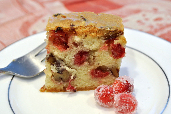 Looking for something sweet and seasonal that comes together quickly and tastes great? This cranberry cake fits the bill. My neighbor Polly gave me a slice of this a while back and I could have sworn it had almond paste in the recipe. But no, it’s almond extract and the rich taste comes from the butter – 1 1/2 sticks of butter. I served it in small pieces at a reception recently, but you can throw cholesterol caution to the wind and make them true squares if you like, as the title suggests. You might be skeptical when you see that it’s made without any baking powder, but as you can see from the photo, it rises enough from the eggs in the recipe. The top is crunchy and breaks apart easily, so make sure you wait until the cake is cool before cutting – preferably with a serrated knife.