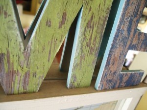 To cover the chipboard letters with the scrapbook paper  – I layed the letters on the paper and traced around each letter and then cut them out. I wasn’t too particular about the cutting since I planned on using some sandpaper at the end to distress the letters.