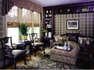 The plaid papered library show here is in a traditional home. It features built in shelves for favorite books and memorabilia. The cozy leather sofa is a comfortable retreat. “It’s my veg out room,” says the homeowner. The trophies from dog shows recall her days as a dog breeder. It is a very personal and very comforting space designed by Ziering Interiors.