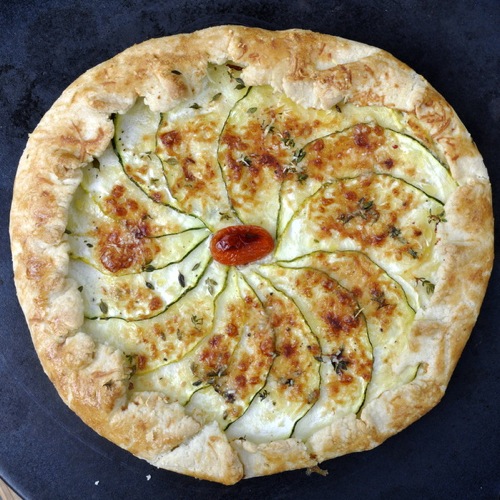 Heat a baking sheet or pizza stone in a 375 degree oven. Mix ricotta and goat cheese (and egg, except for a little bit to brush on top later) together until smooth. Add lemon zest and salt and pepper to taste. Roll out your dough into a circle (directly on a piece of parchment paper on your countertop). Spread cheese mixture over the dough, leaving a 2″ border. Arrange zucchini slices in an overlapping pattern. Sprinkle with fresh thyme leaves, salt, pepper and the grated Parmigiano-Reggiano cheese. Drizzle a little olive oil over the zucchini. Fold the the edges of the crust up over the filling. Brush the crust with the beaten egg. Lift the parchment paper with both hands and transfer to the baking sheet or pizza stone. Bake at 375 degrees for about 35 minutes. Serves: 4 as a main course, 6-8 as an appetizer
